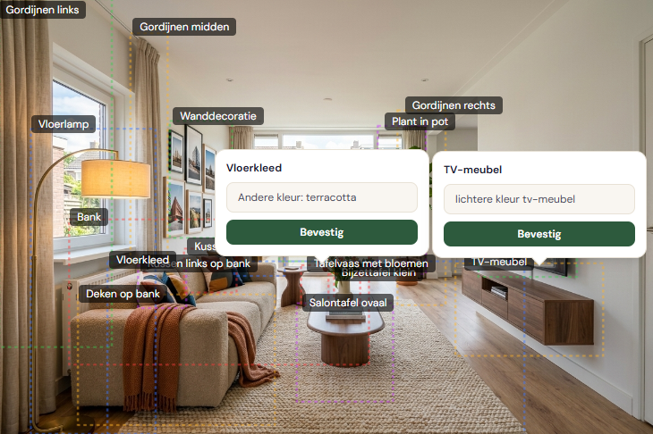 De AI herkent automatisch alle objecten in de foto en geeft ze een label. Klik op het object dat je wilt aanpassen en typ wat je anders wilt. De AI past alleen dat object aan, de rest blijft.
